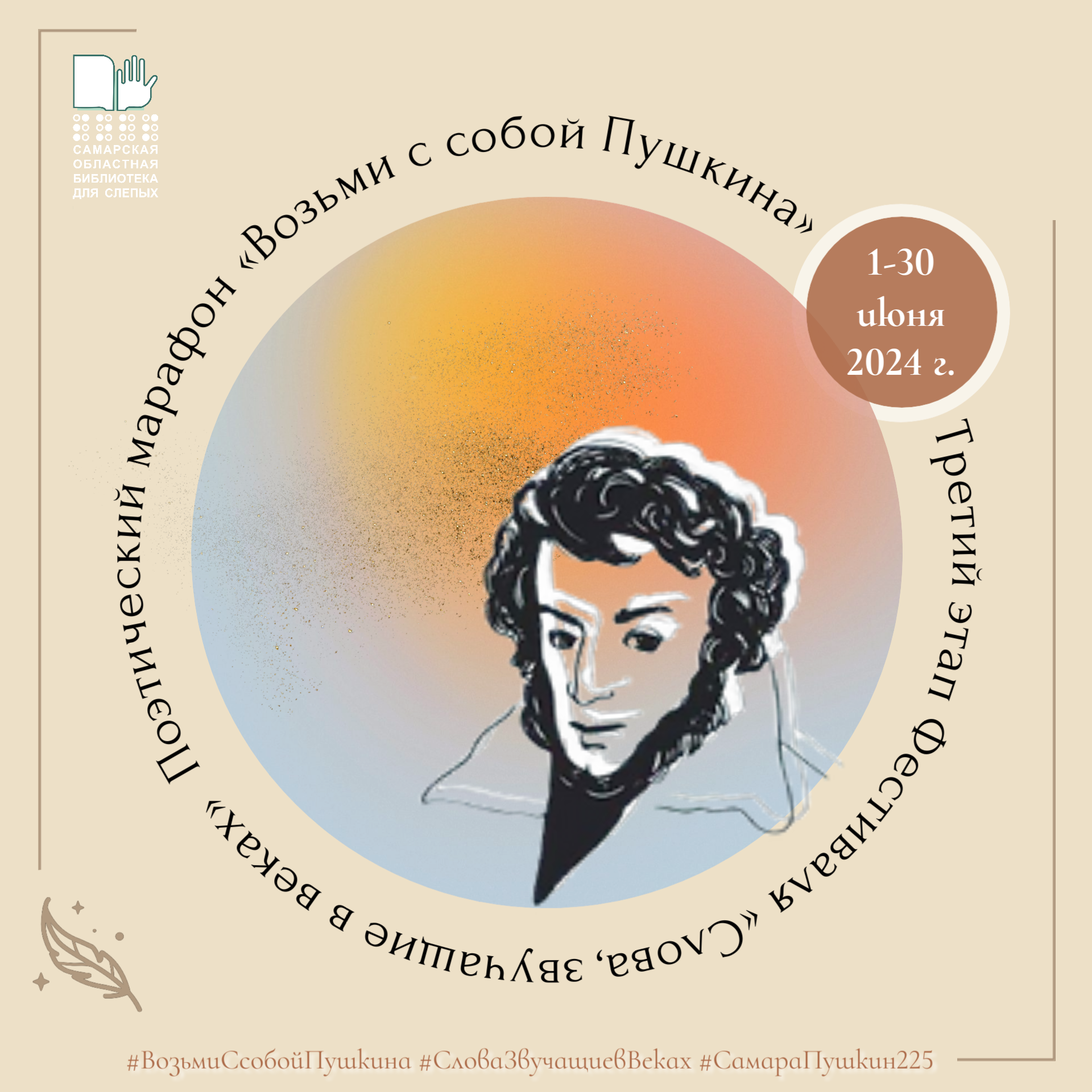 ✅В период с 1 по 30 июня 2024 г. снять видео с прочтением поэтических произведений А. С. Пушкина в самых нестандартных для этого местах и интерьерах — в путешествии, в походе, на даче, в спортзале, на вершине горы и так далее — и опубликовать пост в социальных сетях под общими метками акции: #ВозьмиСсобойПушкина #СловаЗвучащиевВеках #СамараПушкин225