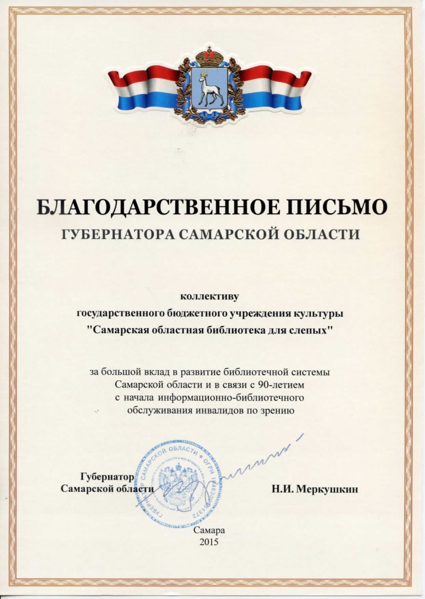 Благодарственное письмо Губернатора Самарской области