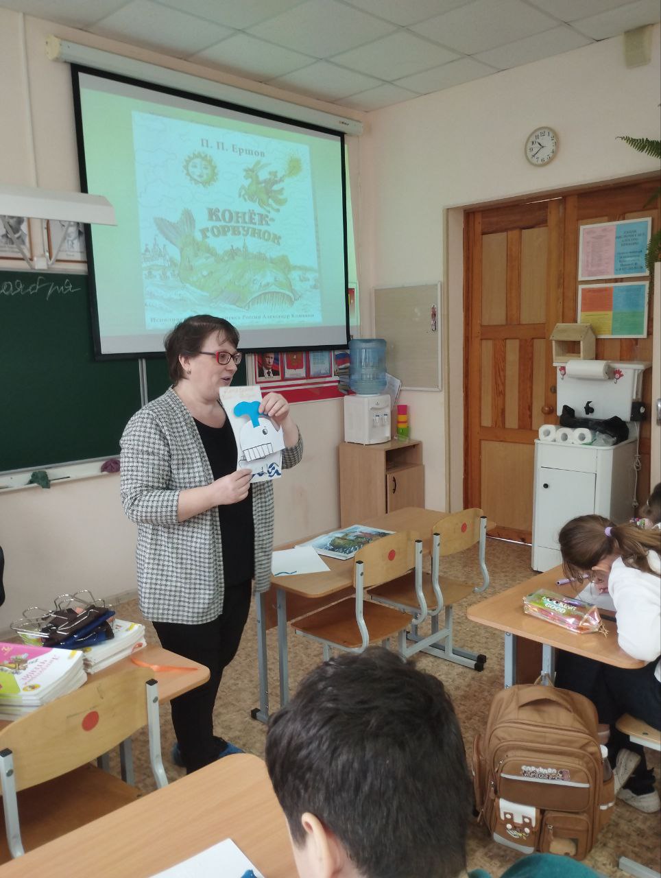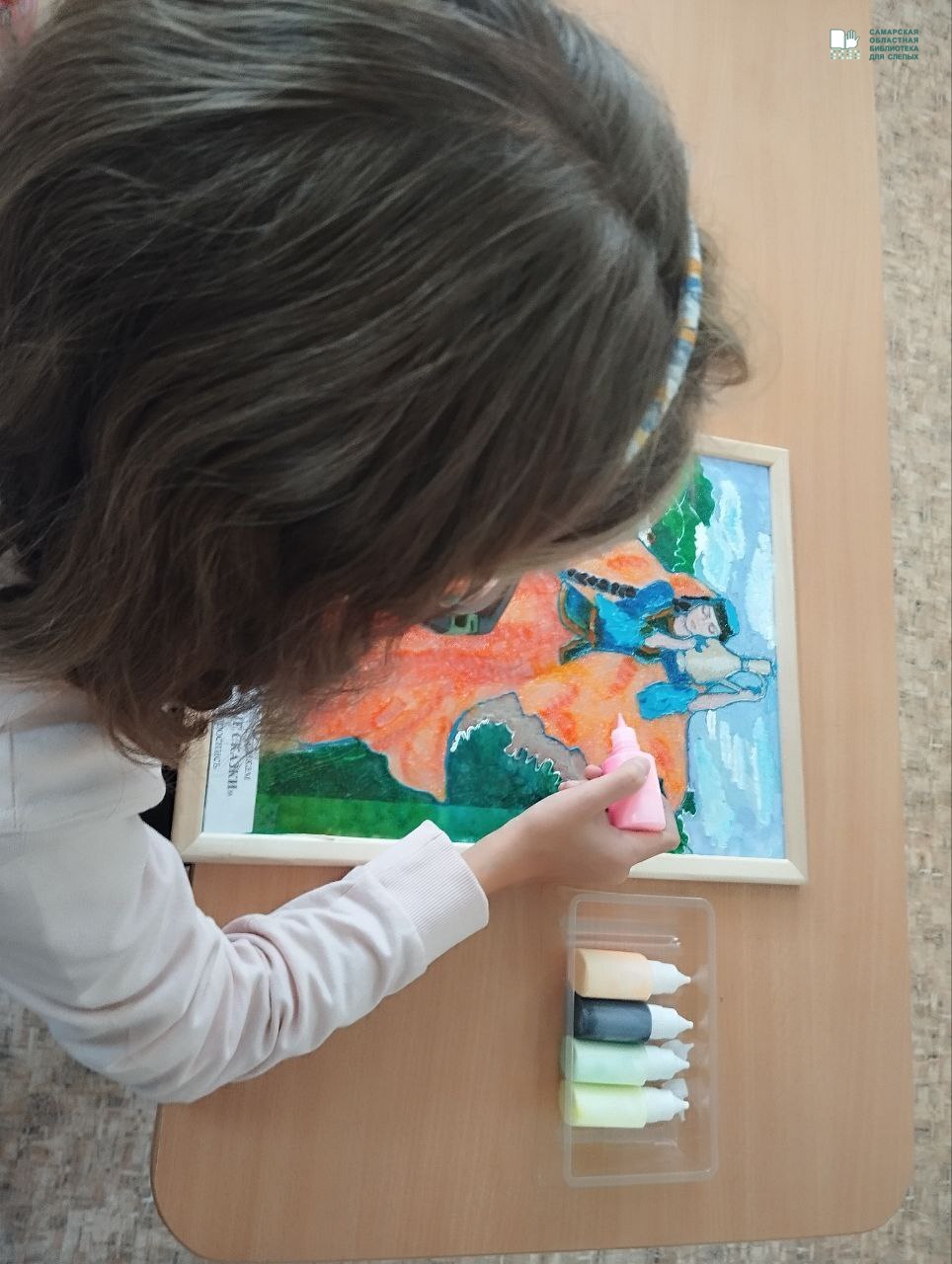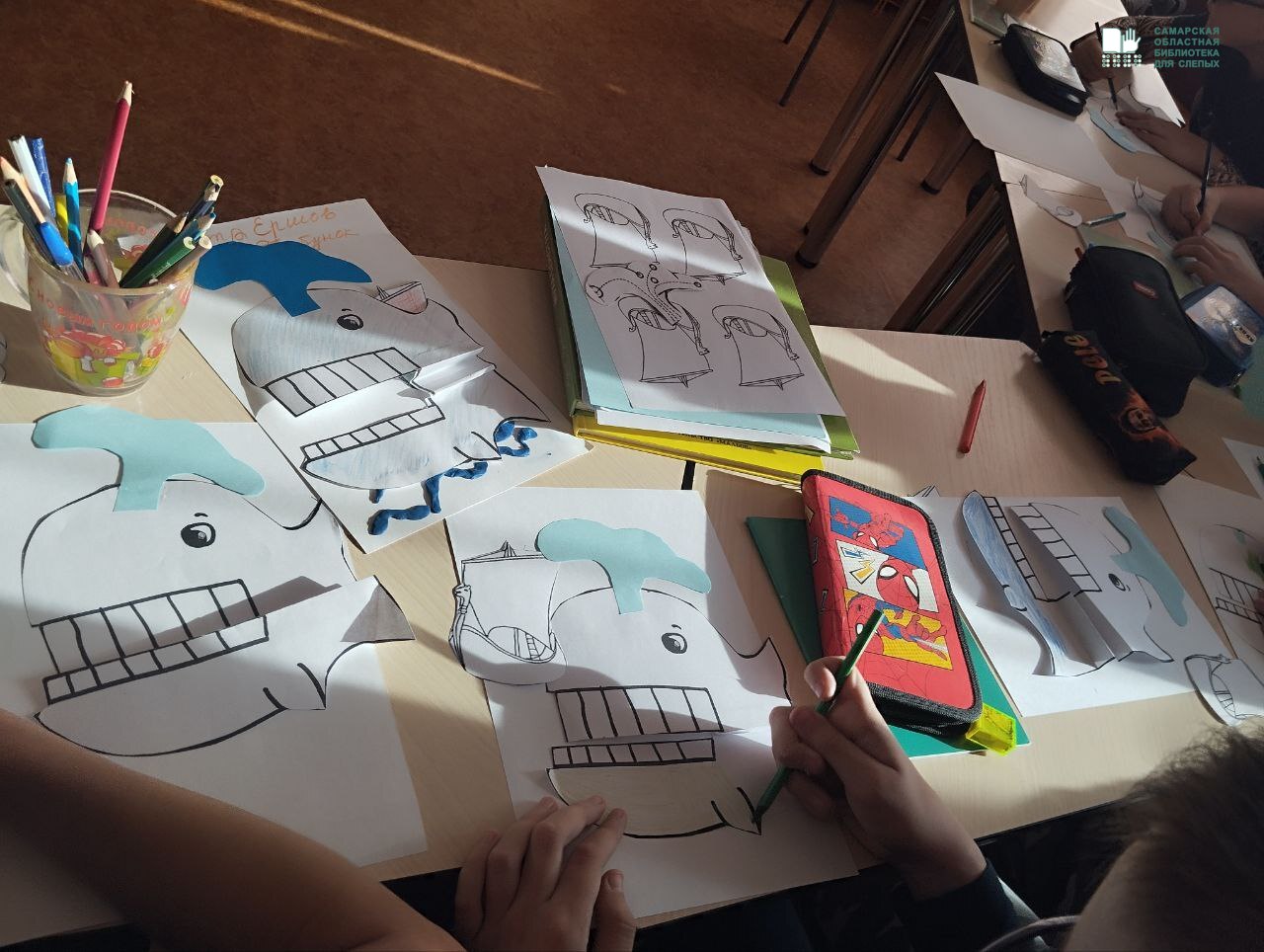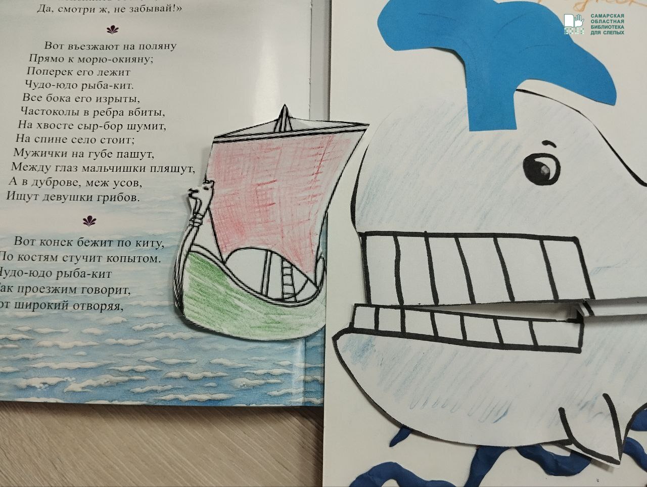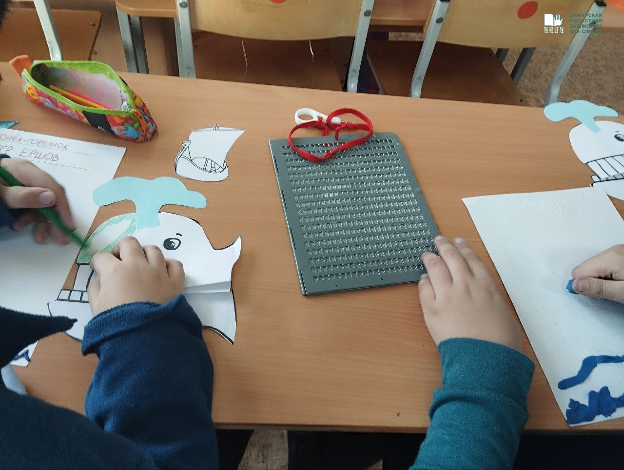 Вспомнив сюжет, главных героев сказки в стихах российского писателя Петра Ершова, ребята вместе с ведущим методистом Самарской областной библиотеки для слепых Наталией Михайловной Шапко изготовили оригинальные макеты обложки по сказке «Конек-горбунок». С использованием различных материалов (бумаги, картона, пластилина, цветных карандашей и фломастеров) на макете книги ребята изобразили одного из ярких персонажей знаменитой сказки «Конек-горбунок» - рыбу-кита, царя «осетриного народа».