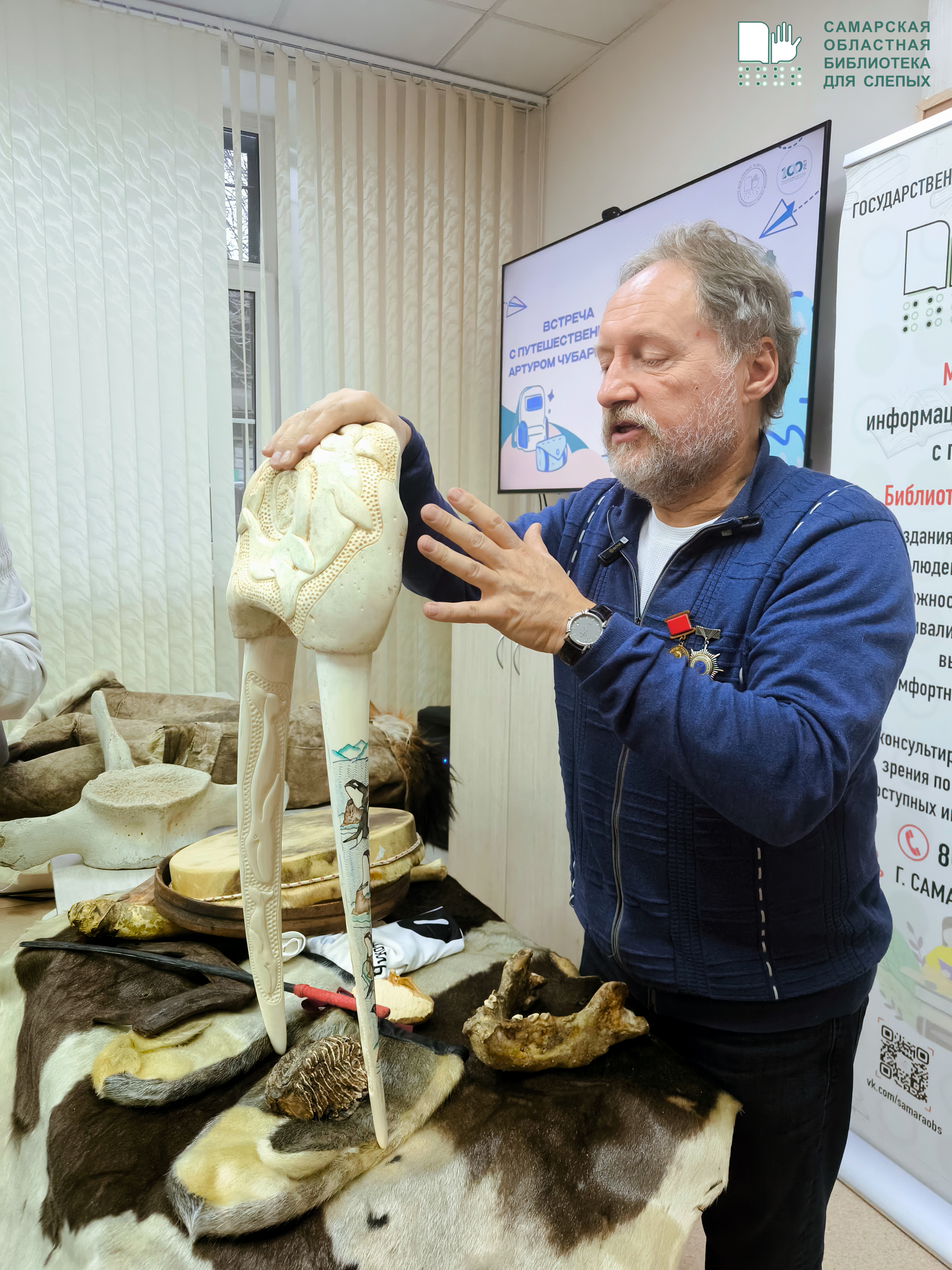 В канун Международной просветительской акции "Географический диктант" в Самарской областной библиотеке для слепых прошла встреча с заслуженным путешественником России, членом Русского географического общества Артуром Чубаркиным.