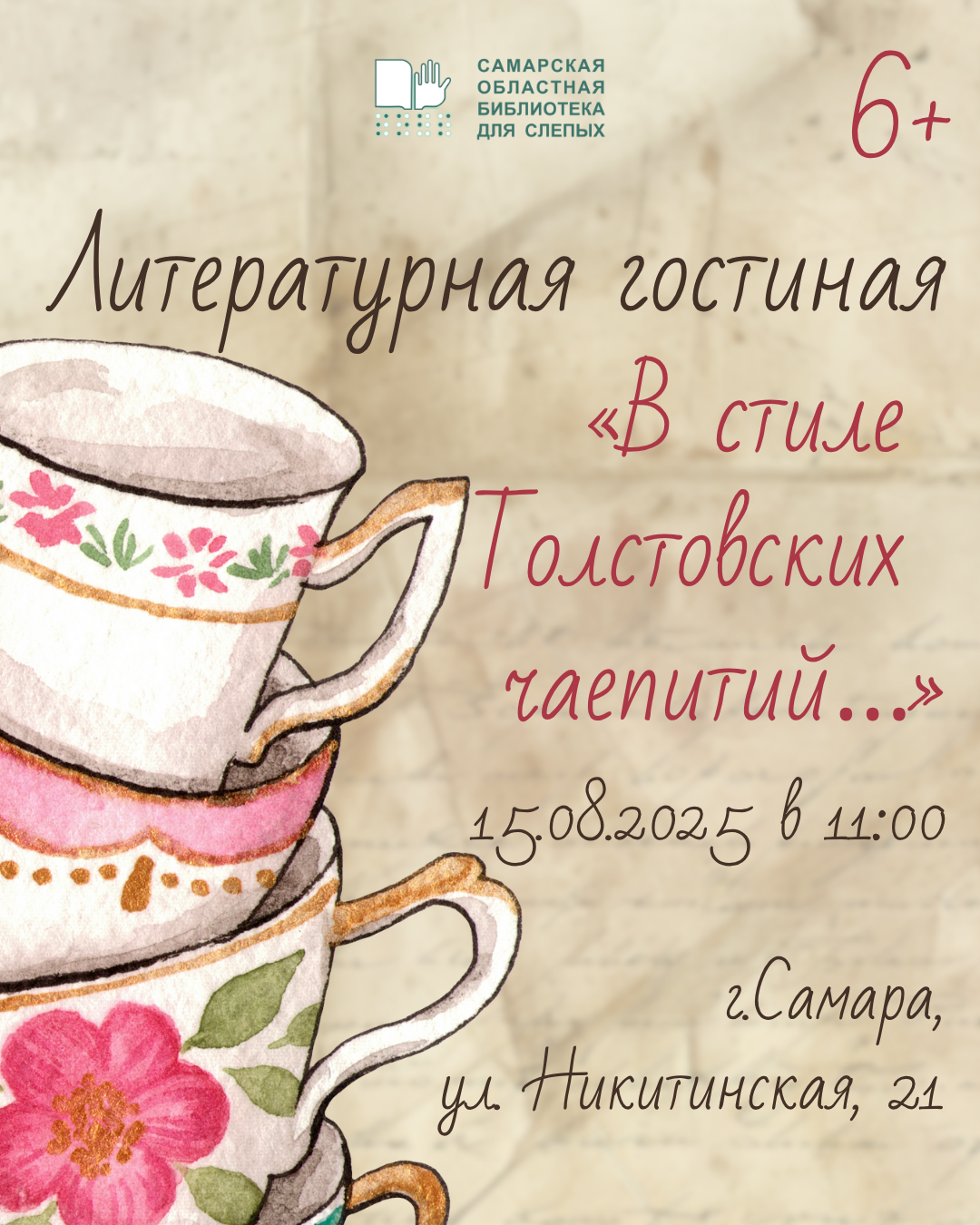 Дорогие друзья! Приглашаем всех 15 августа в 11:00 на литературную гостиную «В стиле Толстовских чаепитий…» по адресу: ул. Никитинская, 21.