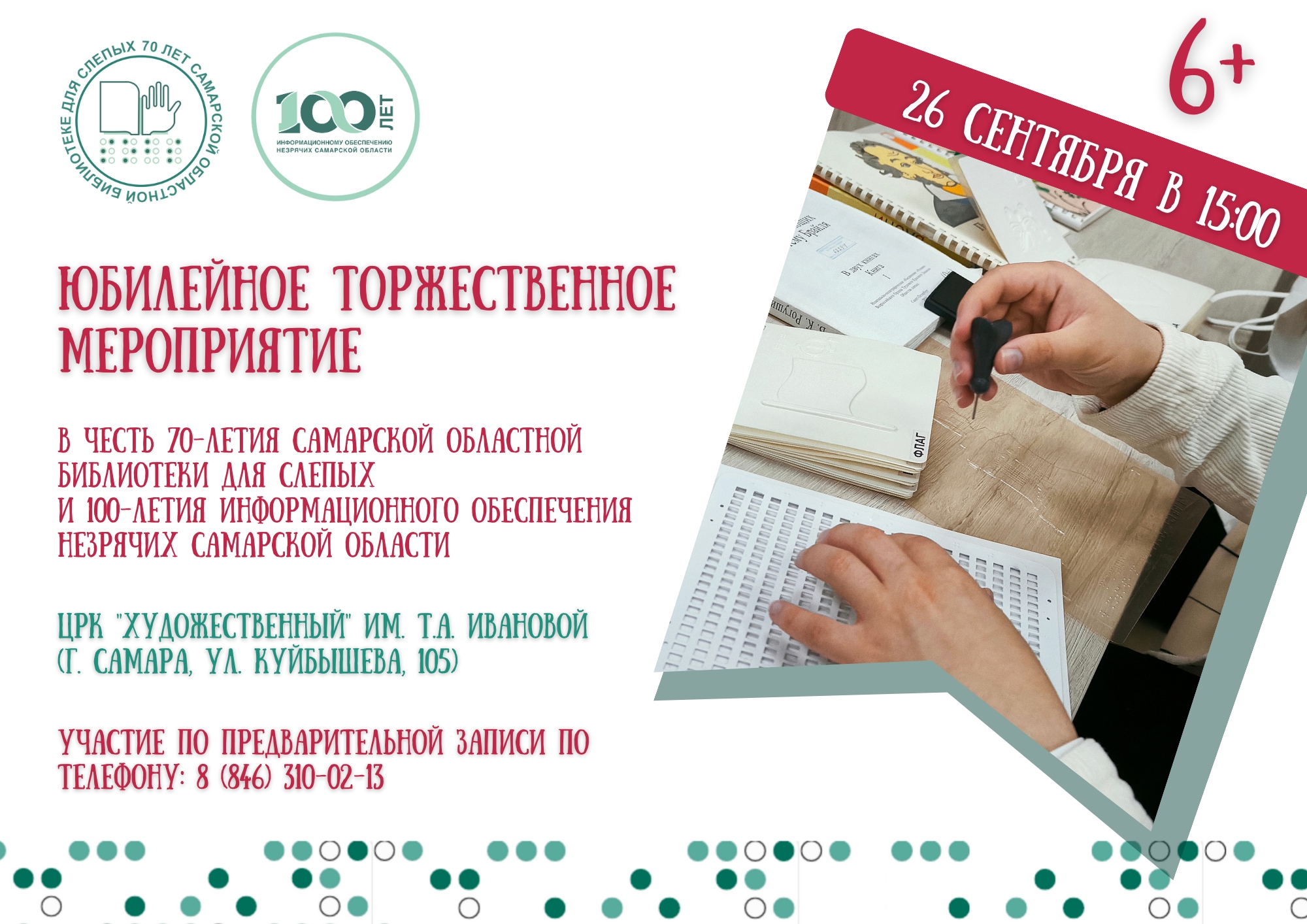 Самарская областная библиотека для слепых приглашает сотрудников учреждений культуры принять участие в качестве спикеров в Межрегиональном вебинаре «Создание условий для развития творческого потенциала людей с особыми потребностями в учреждениях культуры и образования». Вебинар состоится: 27 ноября 2025 года в 09.00 (Время Московское) в онлайн–формате на платформе Яндекс.Телемост. Доступ к вебинару бесплатный и открыт всем зарегистрированным участникам. Подробнее